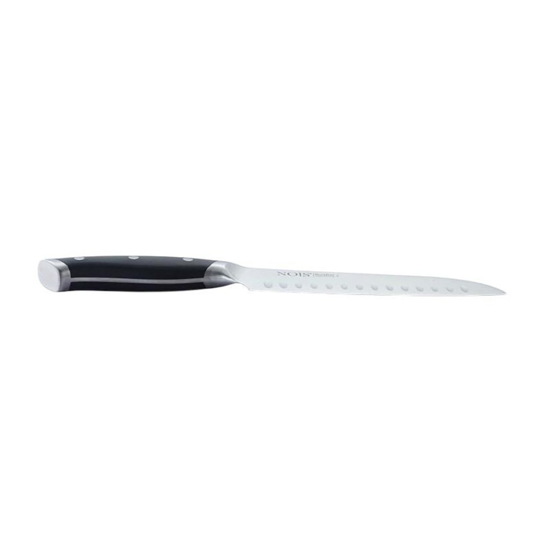 - Specialios įdubos ant ašmenų užtikrina, kad pjaustant agurkus, sūrį ar žuvį, griežinėliai lengvai atsiskirtų nuo peilio.